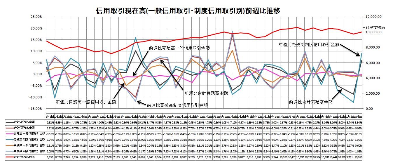 この週(13~16日)の日経平均株価は週間で241円(2.4%)上昇した。米株高や企業業績の回復期待を背景に投資家心理が改善。株価が下落した銘柄を中心に値ごろ感からの物色が集まり、買い残は増加した。