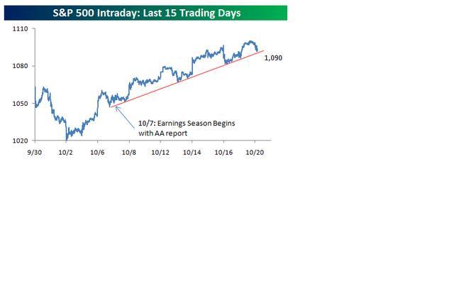 With the equity market's negative reaction to positive earnings reports overnight and this morning, the S&P 500 is currently testing the uptrend that it has been in since the beginning of earnings season when Alcoa (AA) reported. Currently, the uptrend stands at 1,090, so as the index drifts down near that level, traders can expect at least an attempt to bounce at support.