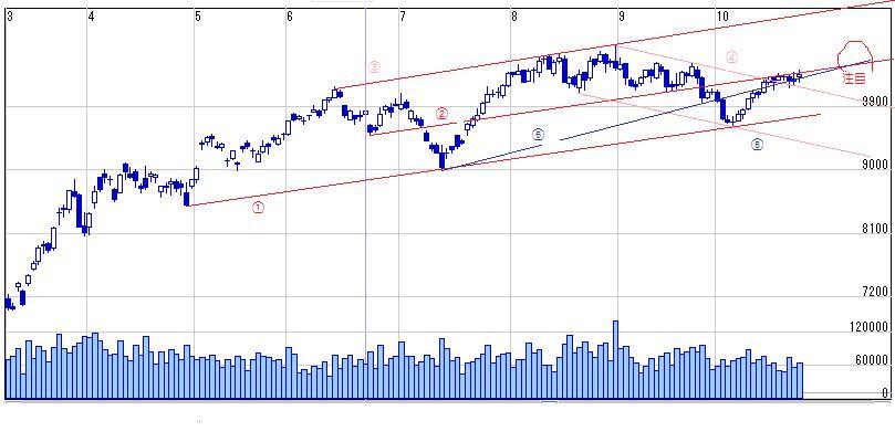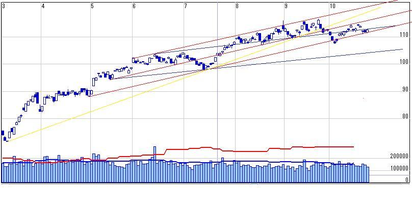・週足基準線が切り上がってきたので下値めども9880まで切り上がったものと考える(10月前半の下げでも週足基準線が下値支持となった)