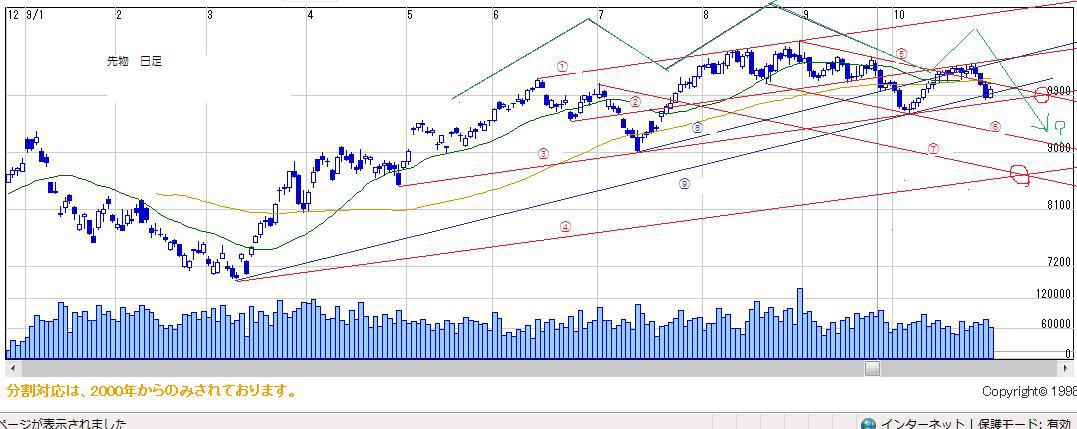 ・②-③のレンジ相場と考える。③を割り込んだ時点で⑤-⑥の下落トレンドへ移行したものと考える。
