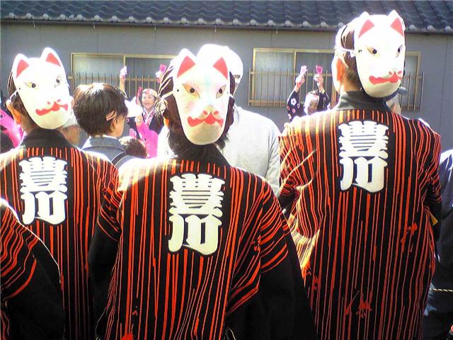 まつり , 鳴海宿場祭り , 猩猩:鳴海宿場祭り今度は、1.猩猩の軍団がうちわを持って子供をなでるや否や泣き出します。怖い、すごい行列です。2.踊りの猩猩チーム、毎年優勝しています。3.豊川稲荷の狐のお面もかわいいです。ただで絞り体験もでき面白いです。