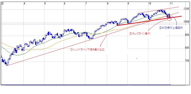 ①3月からのトレンドラインを割り込む