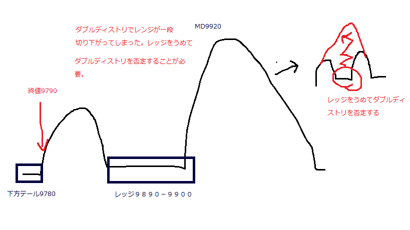 おとといもダブルディストリで上へレンジが切り上がり、昨日はレッジをうめてダブルディストリ拒否、本日はダブルディストリで今度は下へレンジを切り下げ、、、
