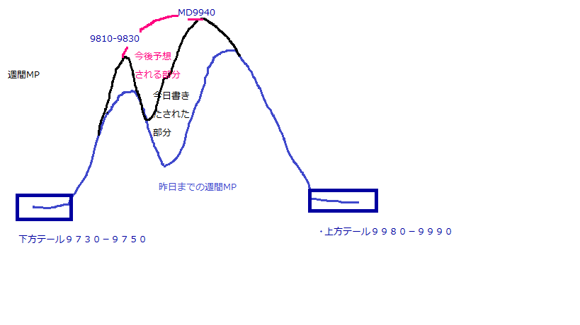 原因としては昨日のダブルディストリで下へレンジが切り下がったのを、本日レッジを埋めることができればダブルディストリ否定で再度上を目指すこともできましたが、MPの山に上値をおさえられ、レッジ埋めに失敗し、そのまま下方テールも埋める動きとなり(9780をうめきったので売りサイン)、さらに週間MPの下方テールまで埋める動きとなりました。ただし、下方テールは消滅したのですが、埋めきってさらに下落する動きとはならなかったので、だましであった可能性もあります。