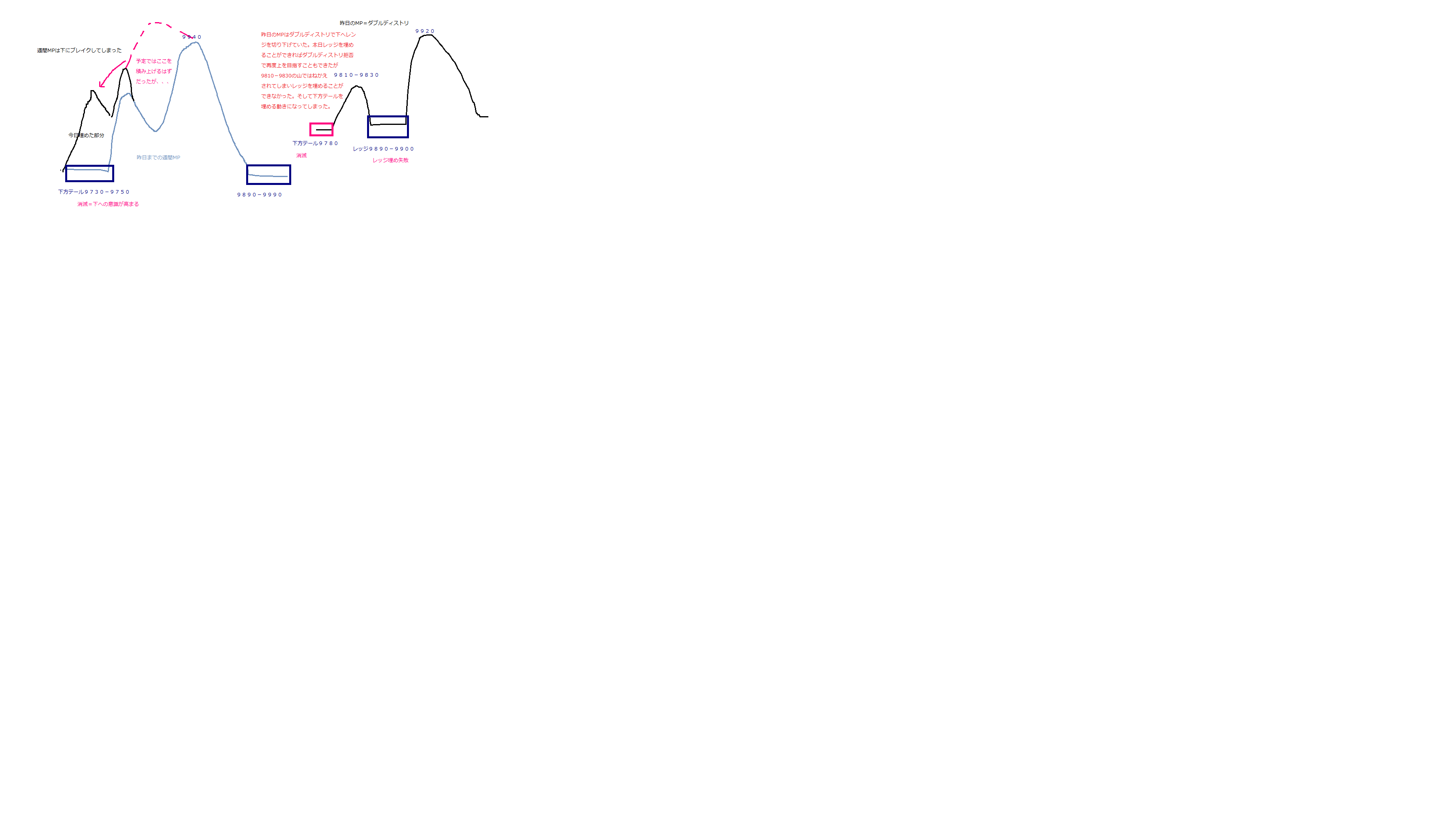 まずは①今日うめられなかったレッジ(9890-9900)を埋めること(ただしすぐ上に9920に山があるので押し返される可能性がある)