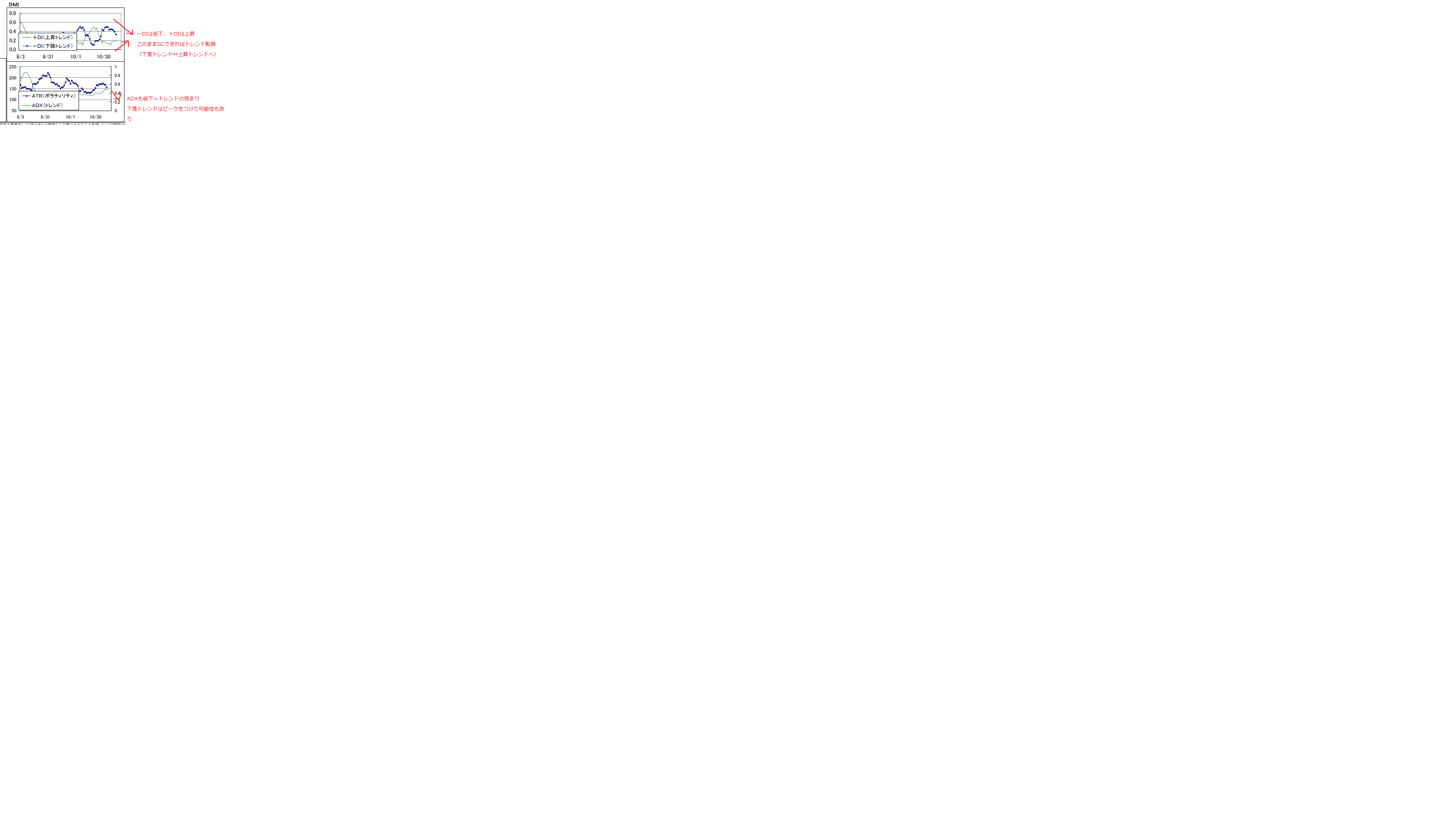 ・-DIは低下中。このまま行けば+DIとGCしそうです。+DIがGCできれば下落トレンドは終わりです。