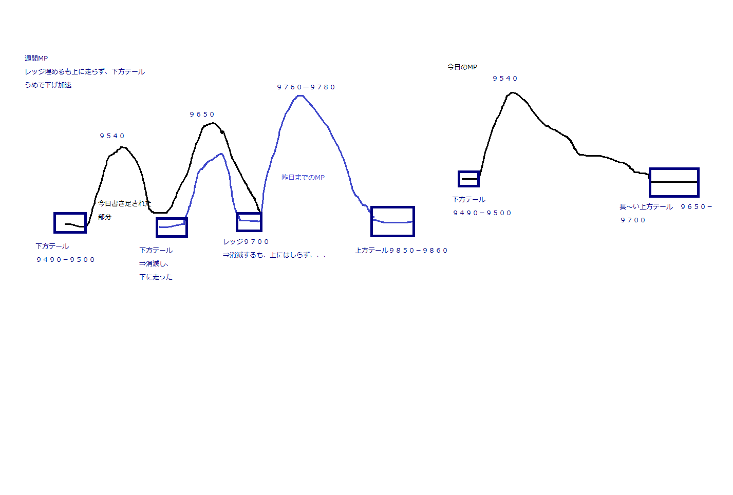 明日は、9490-9500の下方テールをうめるのか、9650-9700の上方テールを埋めるのかに注目したいと思います。