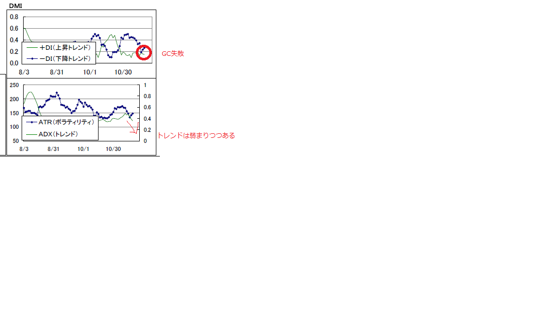 ・DIはGC失敗だけど、ADXも低下傾向にありますので、ここから下落トレンドが強まるというよりは、下落スピードも弱まりつつあると考えたほうがいいと思います。
