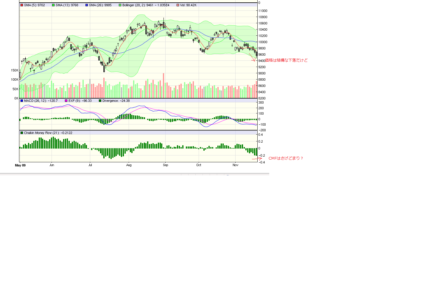 資金の逃げはとまったかんじもしますが、一日だけでは判断できません。明日以降CMFが上昇に転じるのか、そしてプラス転換できれば本格上昇がありえると思います。
