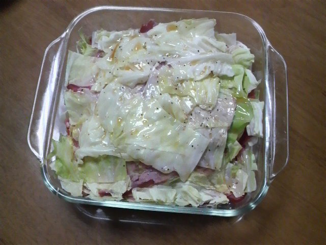 原本はオレンジぺージよりのアレンジ料理。作り方は、ひと口大に切ったキャベツを耐熱容器に敷き詰め、上に1/4程度の大きさに切ったペッパーハム、キャベツ、ベーコンの順に交互に積み重ねていきまする。