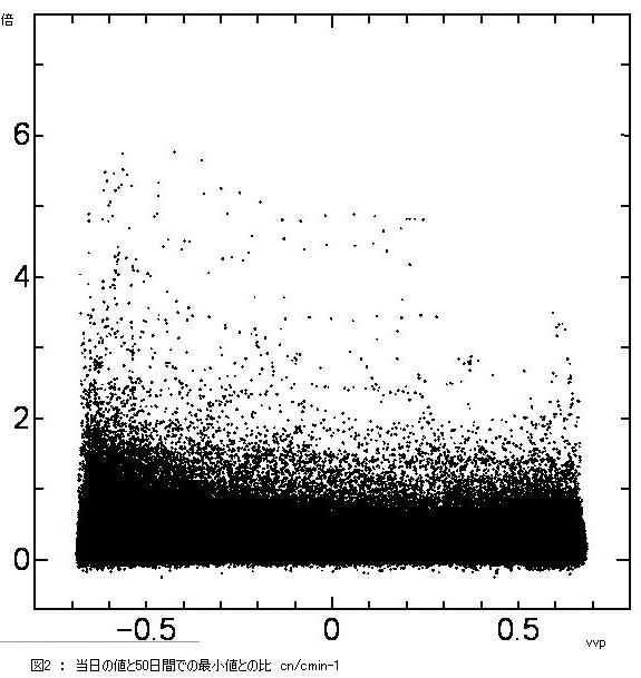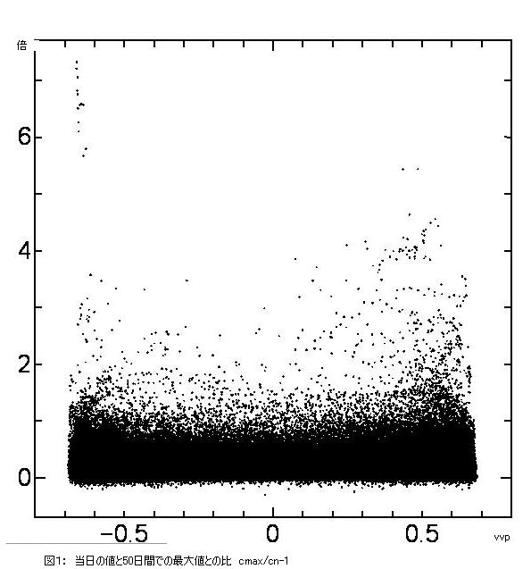 得られた結果は図のとおりである。横軸にn日のVVR、縦軸に倍率をとっている。ここで倍率とは、n日の終値をcn、n+1日からn+51日までの間の最大の終値をcmax、最小の終値をcminとし、
