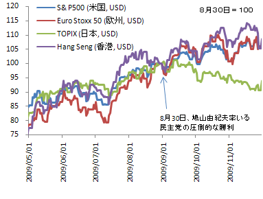 もう少しくわしく株価をみてみよう。ここでも世界各国の株価をくらべるためにすべてドルに換算した。図2をみると日本株の下落はちょうど民主党政権が誕生してからはじまっていることがわかる。このわずか3ヶ月の間に世界の主要先進国の株価から比較して15%も下落した。