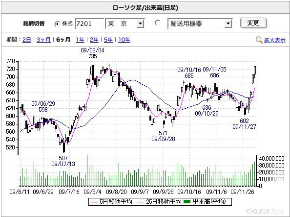 先週末の日産の引け値が605円、月曜日の始値が618円、そして今日の引け値が728円・・・見てるだけでは勝てませんよねぇ~。ニラレバ・・・じゃなくてたられば。