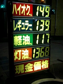 我が家が給油してる近所のセルフスタンドも2年前は普通に給油してくれるスタンドでしたが、現在、無人です。その代わり24時間営業になりましたが。ちなみに、JA(農協系で出光のブランド)の経営です。田舎だものですから...。価格の写真を載せました。皆さんの地域は今おいくらですか?ガ・ソ・リ・ン代。
