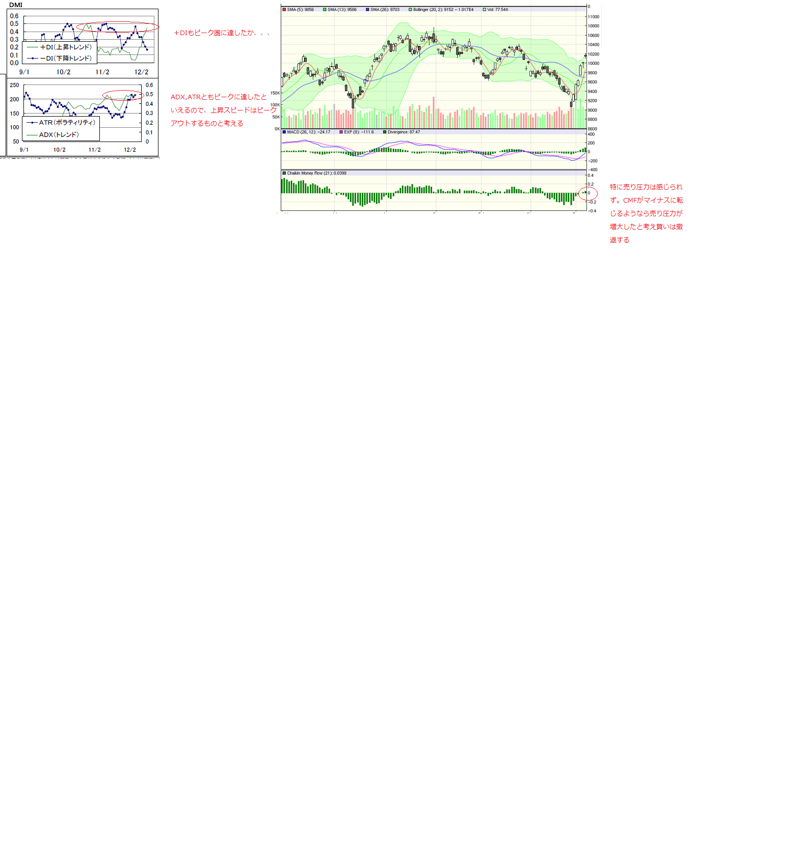 ・DMIはピーク圏に達したので上昇スピードの弱まりを示唆している。上昇トレンド⇒横ばい相場に突入するかもしれない。