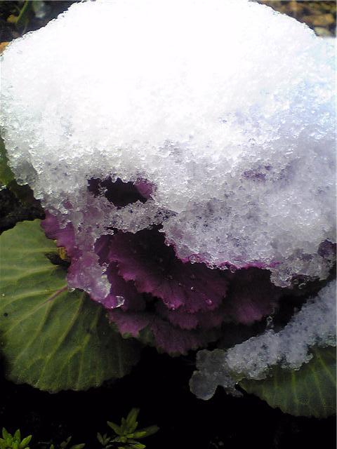 はな、雪、菊、葉牡丹:元旦の雪の中の花です。まだ菊も咲いていました。