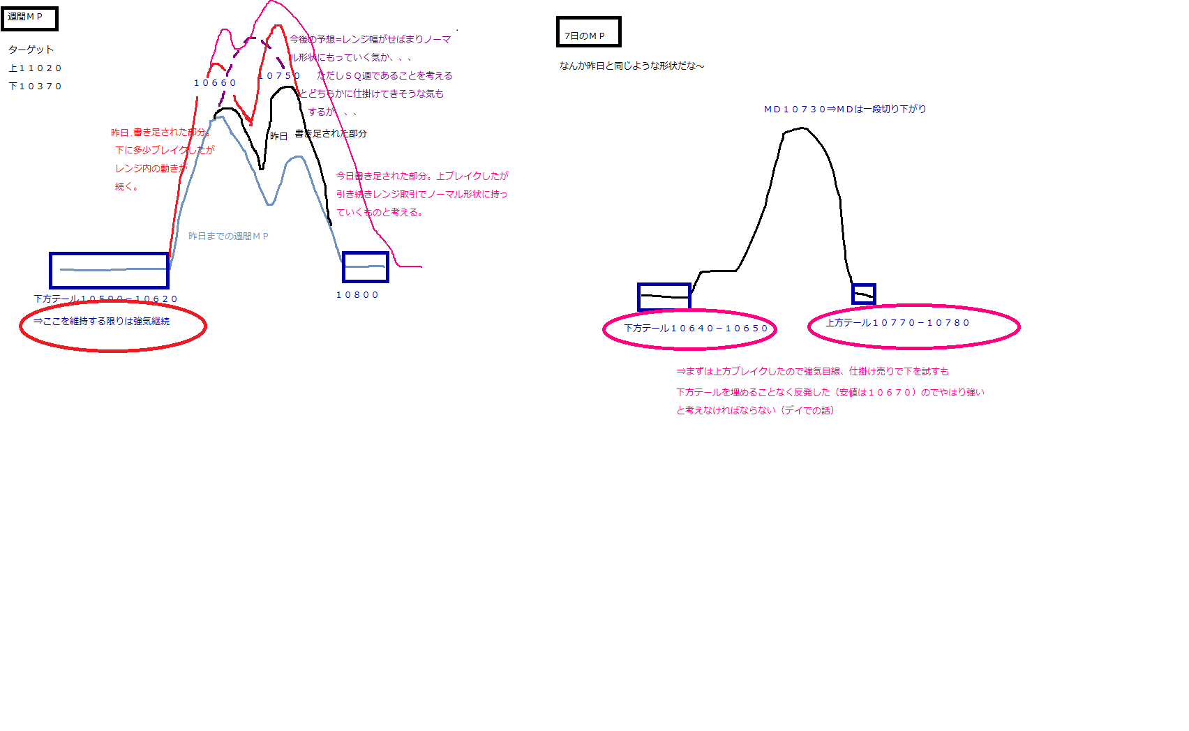 今日のポイントは14時頃の10700-10720での動き!日中MPはDDでレンジ切り下げとなっていたのが、ここを埋めたことによってDD否定でレンジ切り下げに失敗した(売り方の負けが決まった)のでその後のショートカバーにつながった