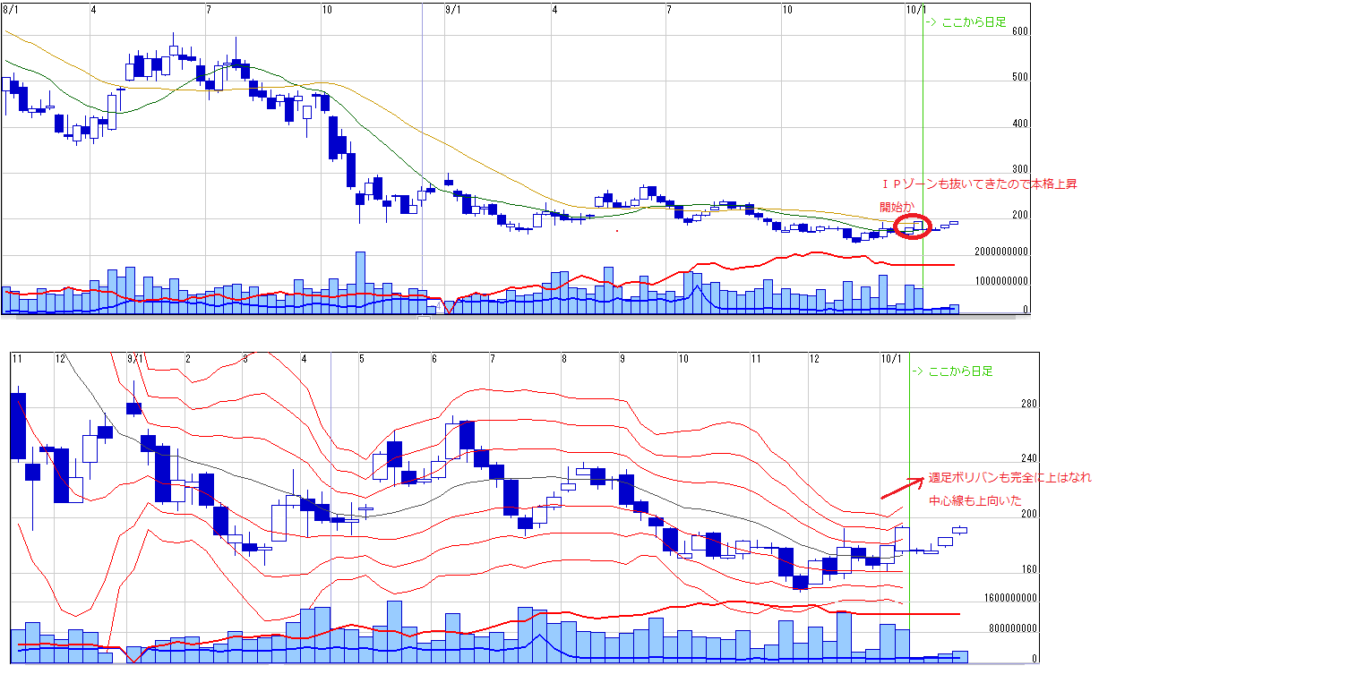 ・週足ボリバンは中心線が上向いてきたので上はなれ