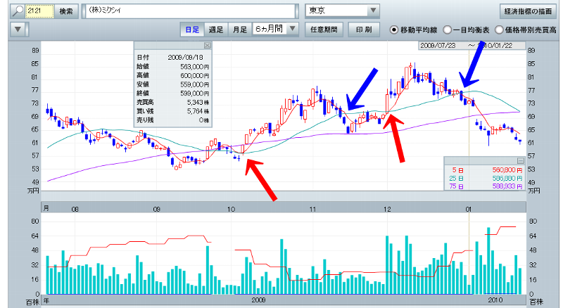 写真は、2121:ミクシイですが、GC買いのDC売りは、底買いの天井売りと比べるとマチガイなく利益幅は少ないです