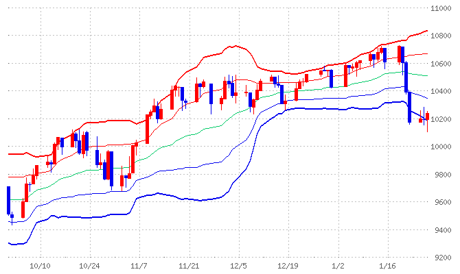 > ダウ(左1/27日足チャート)がボリンジャーの-2σで踏ん張り、