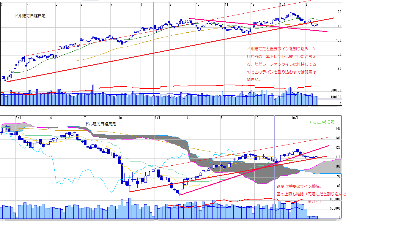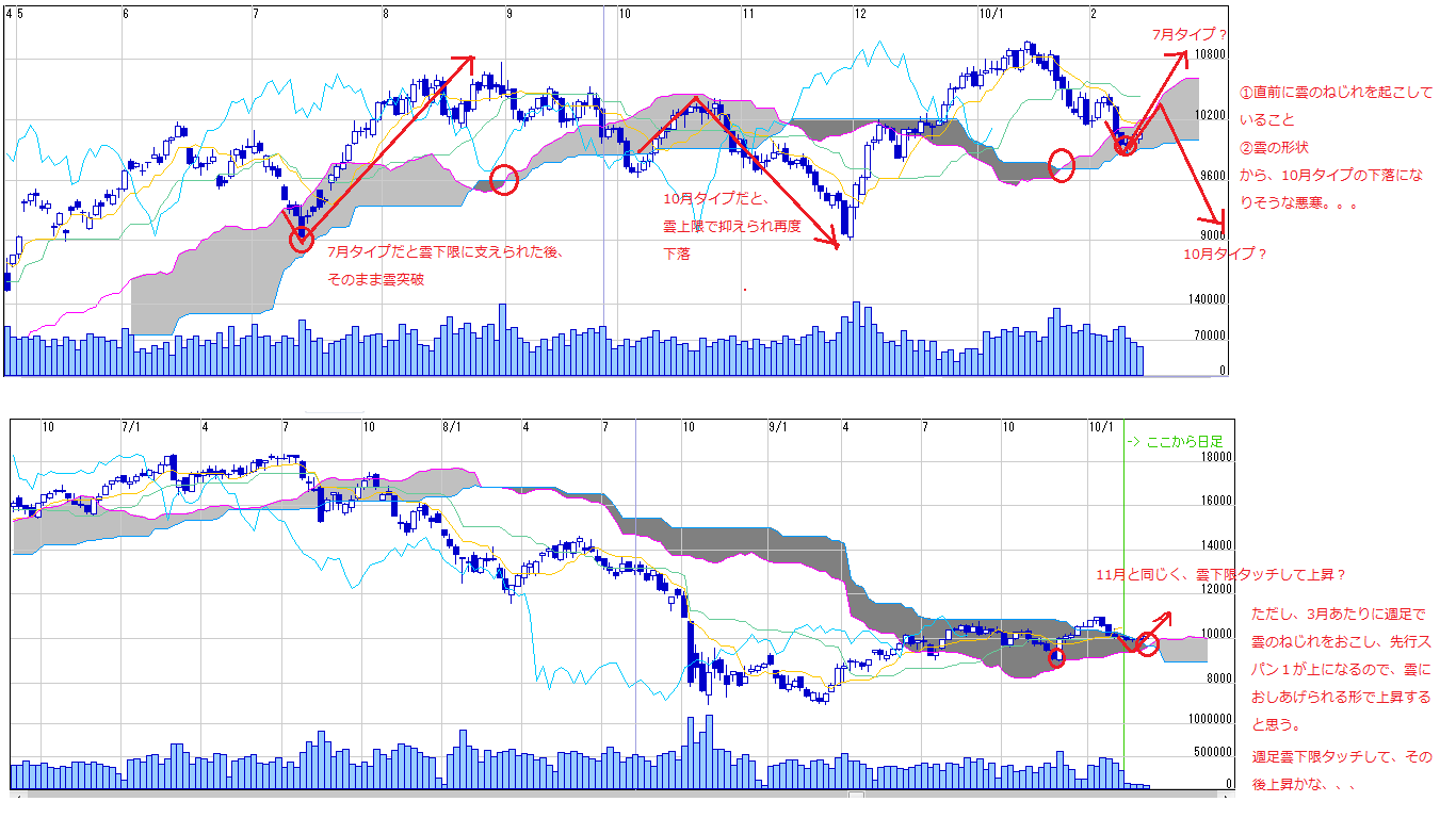 ・10月タイプの下落なら一旦くも下限で下げ止まるも、雲上限で押し返されて再度下落