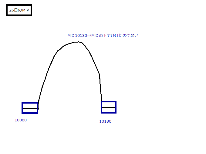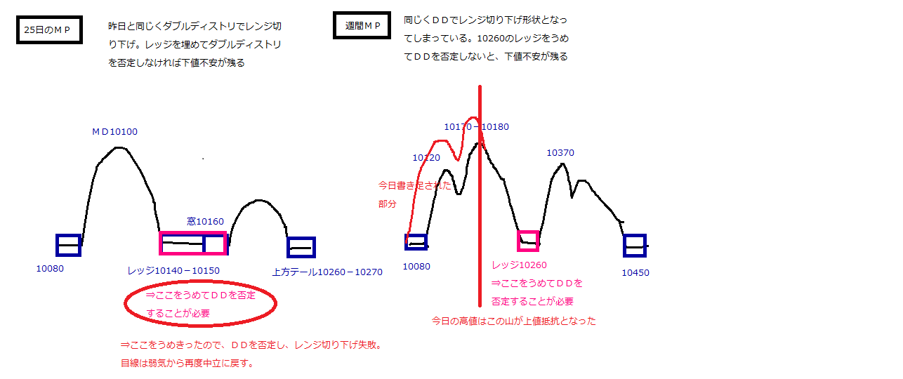 ・昨日のレッジをうめて、ダブルディストリ否定でレンジ切り下げは失敗。ただし、10170-10180の山が上値抵抗となってしまった。まずはこの山をクリアして、10260のレッジもうめて週刊MPのDDを否定することが底打ちの条件