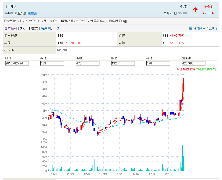 2月16日に、372円で、6463:帝国ピストンリング が発射寸前か???と書きました