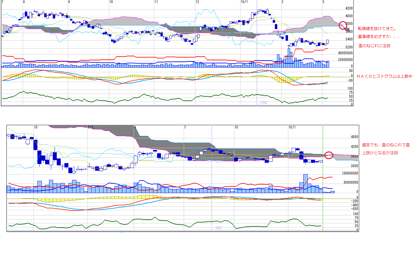 価格帯別出来高みると、3500どころに2・2-3日にあけた窓が3500どころにあるので、ここを抜けるか、抑えられるかで決まると思います。