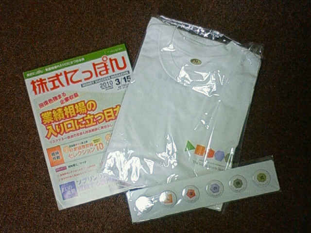 みんかぶの20万人ありがとうキャンペーンに当選したらしく、株式にっぽん3/15号とみんかぶノベルティグッズ(Tシャツとバッジ)が届きました。(写真)