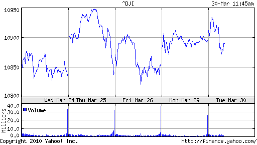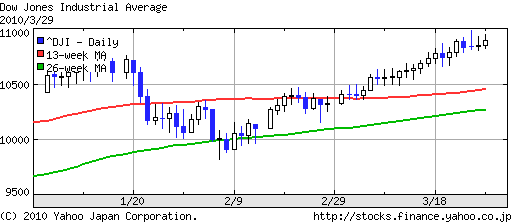 ダウの日足と最近1週間の折れ線チャートです。どうやら高値警戒感があって10800~10950の短期ボックス相場のようです。