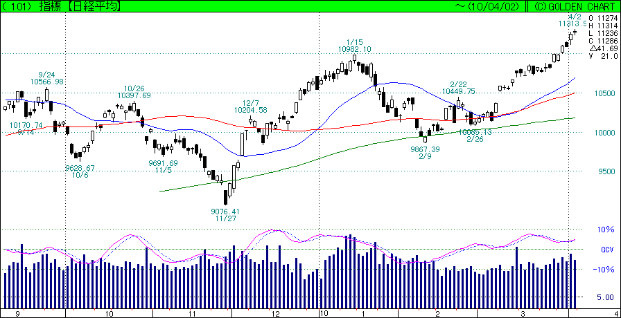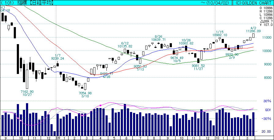 今の相場が何故強いのかは、出遅れ日本株の外国人買い、今期の景気回復期待、正直諸説あってわかりませぬが、週足チャートを見る限りでは、このあたりまでの上昇は、まだ妥当な範囲内かもしれませぬ。ここから先はさすがに調整あるかと見ておりまするが、長期的にはまだ強いのではないかと。