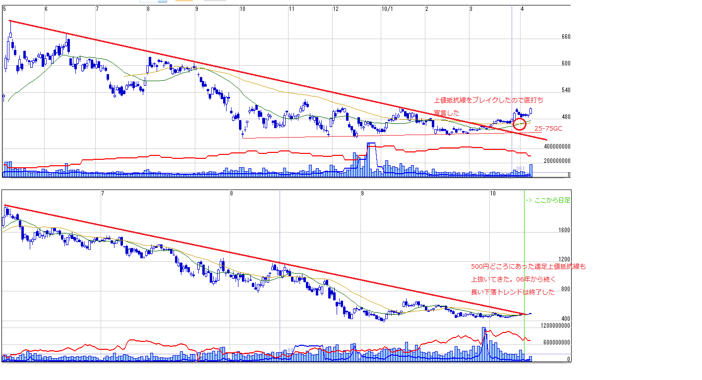 2006年から4年間ほど続いた長い下落トレンドを脱したものと考えます。