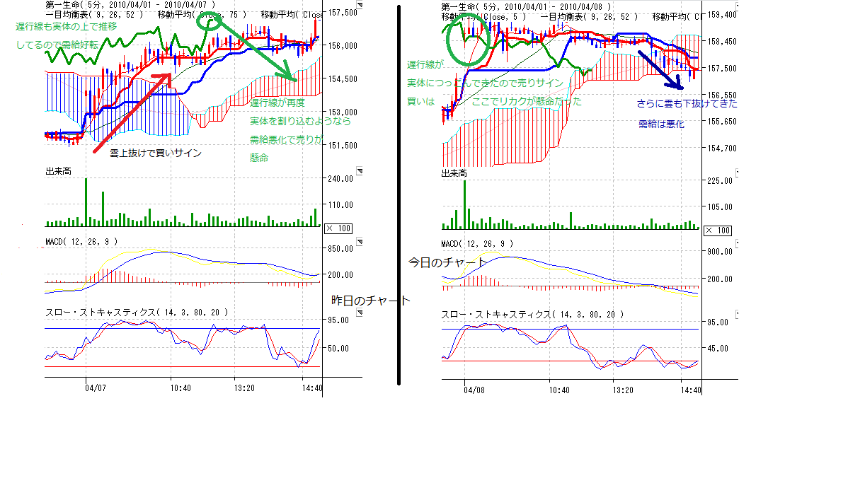 昨日は終始遅行線が実体の上で推移してたのですが、本日寄りつきでいきなり遅行線が下ぬいてきました。