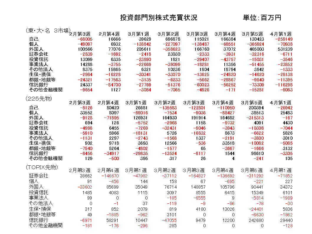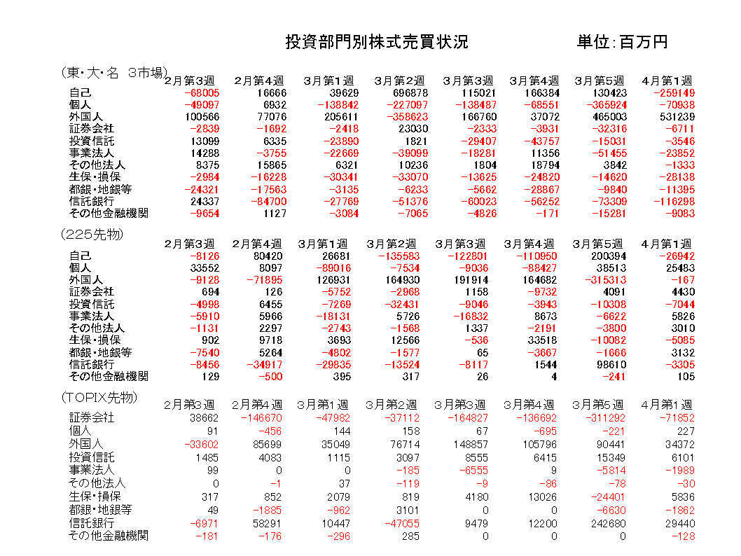 その他法人が売り越しに転換し、買い越しは外国人のみになりました。