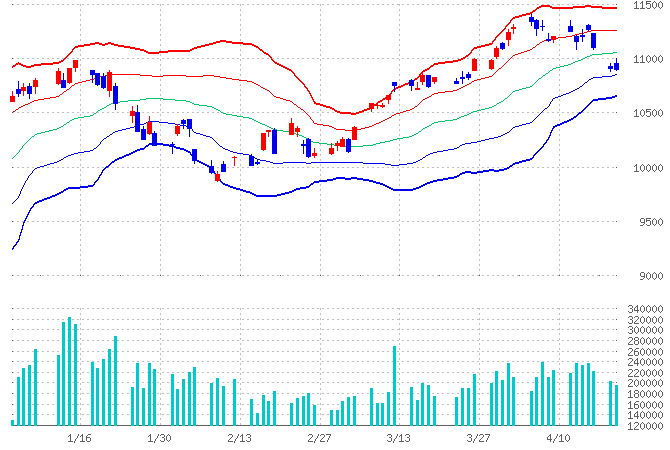 今週に入って25日線割れとなっており、このまま¥11,000を回復できぬようだと、75日線とボリンジャーの-2σのある¥10,600あたりを次なる目処に調整する可能性が出て参るかと存じまする。