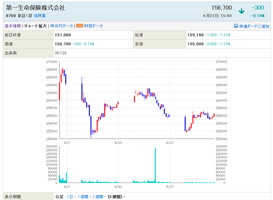 8750:第一生命の木曜日の予想高値は?→→159000と書いてましたが、 156700まででしたね 高値引けです。