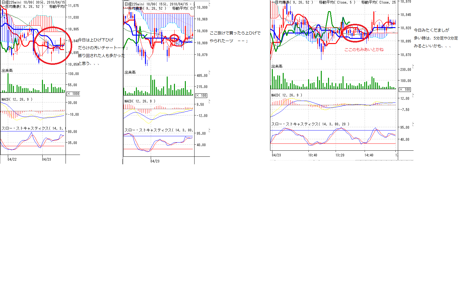 今日は上髭下髭の多い汚いチャートだったから、振り回された人も多かったと思う、、、^^;もみ合い↑抜けでかっては大口売りでくずされ、もみあい↓抜けで売ったら大口買いにやられ、、、こんな日は手出し無用!