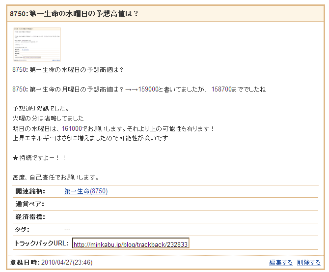 8750:第一生命の水曜日の予想高値は?→→161000と書いてましたが、 158200まででしたね