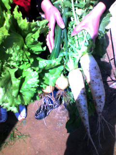 東大寺の後は昼食を食べ、信貴山のどか村というところへ行きました。そこではイチゴ狩りをはじめ、大根などの野菜、卵、シイタケなどを手に入れました。