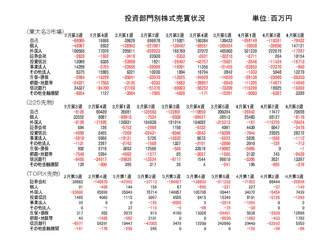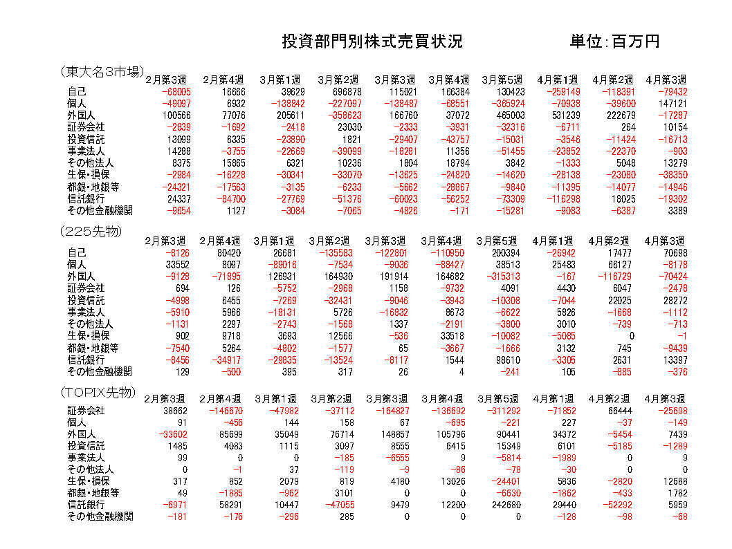 生保・損保は売り越し継続です。TOPIXは買い越しに転換。
