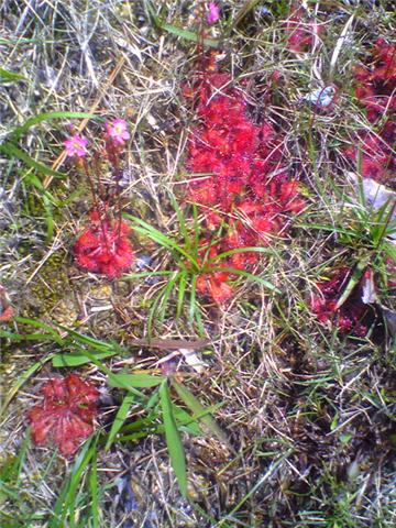 はな、トウカイコモウセンゴケ、モウセンゴケ:トウカイコモウセンゴケが下の説明のあるように朝に行ったので咲いていました。大高緑地でも見られることから、昔は多くの東海地方の池の近くで見られたようです。年々、住宅開発で少なくなっていきます。葦毛湿原(豊橋市)、島田緑地(名古屋市)、壱町田湿地(知多郡武豊町)など保護されているとこのみになりつつあります。1.は花で 2.は群落 3.はめったに見ない貴重な映像で、ハエが捕まって溶ける所です。普通は蚊がほとんどでこんな大きなものはめったに見ません。