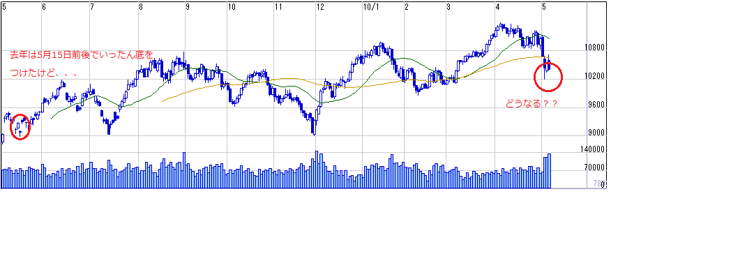 5月15前後を境に、売りも少し落ち着くのでは、、、と思ってますが、ただしギリシャがあるので、底ばい、、、程度でイメージしてます^^;