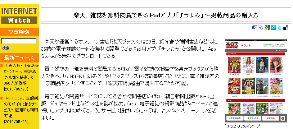 楽天が運営するオンライン書店「楽天ブックス」は28日、幻冬舎や徳間書店など18社36誌の電子雑誌の一部を無料で閲覧できるiPad用アプリ「チラよみ」を公開した。App Storeから無料でダウンロードできる。