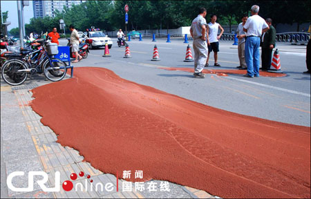 ”17日午後3時ごろ、四川省成都市で路面が長さ5メートル、幅2メートルにわたって突然隆起し、赤茶色の謎の液体が流れ出て来るという事件が発生した。中国国際放送局が伝えた。