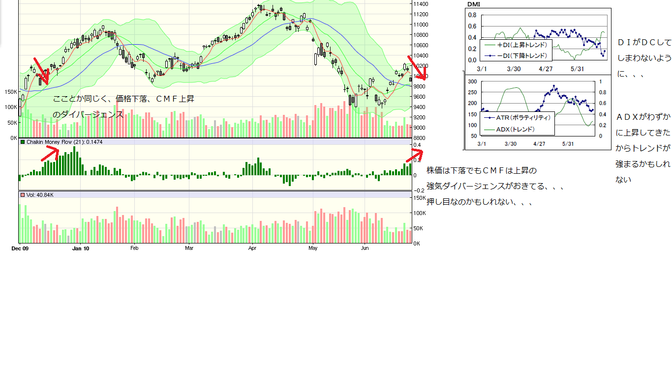 私の指標でも、+DIが-DIの上に出ました。それもあって、日記に上昇トレンドという局面判断を書きましたが、トレンド性が弱く、むしろ保ち合い相場の感じですね。