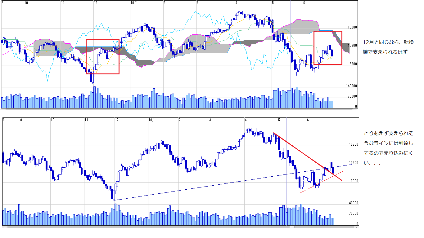 おっしゃるとおり転換線・基準線で支えられると期待して、ダメでも10150あたりの下値支持線がサポートするかな、、、と^^;