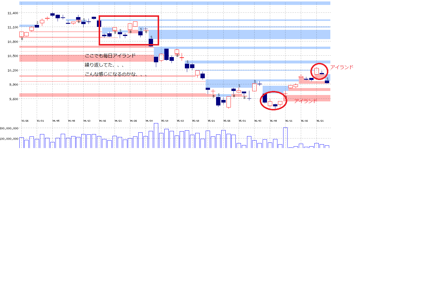 窓やアイランドが多いってことは、米国の乱高下に日本がつき合わされてるわけで…しかも場中はさほど動かないって、どんだけ自主性ないんだよ!といいたくなります。