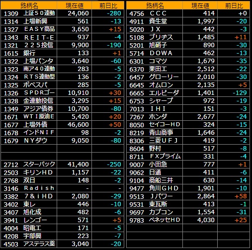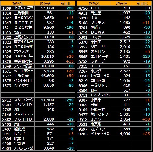 スタバ、買えますね。CCCも手頃そうだし、野村も三菱UFJも・・・。余裕資金がないので1銘柄しか買えないのが痛いところです。当面は黙って1321のボックスで勝負、といったところです。