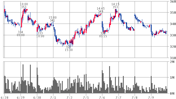 すぐさま、LCを直近の最安値318円を割ったら317円で指値し、目標は始値の339円の手前338円で指値したが、午後も331円から336円の間のレンジ相場になってしまい、翌週に持ち越しそうだったので、引け成行に変更して手仕舞いした。結果は333円だった。以前には何度か下がっては上がったケースがあったので、狙ったのだが、思い通りには行かなかった。