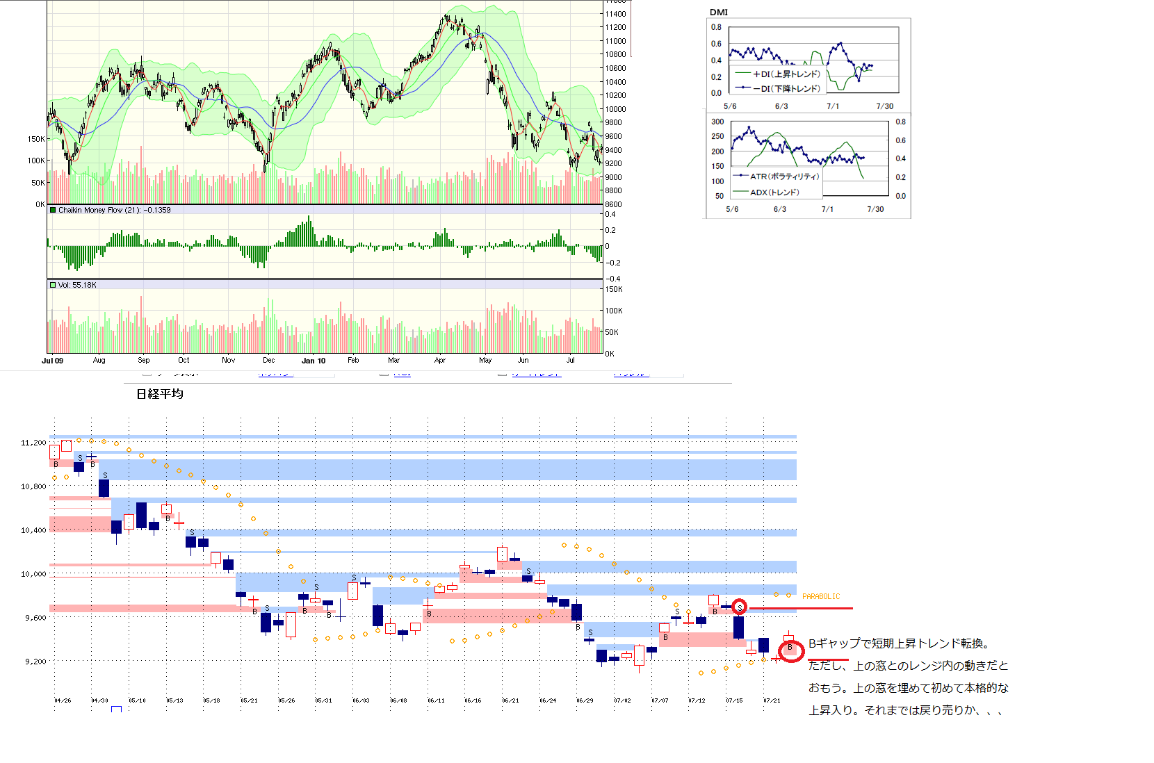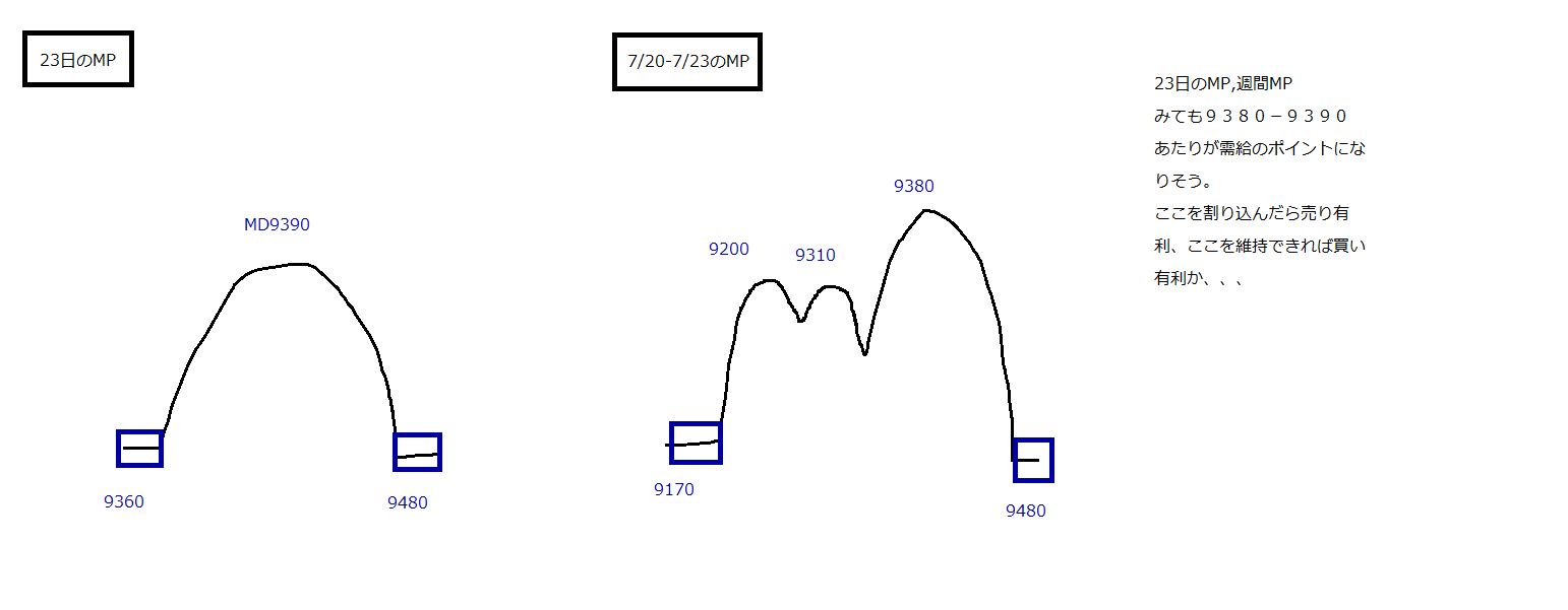 今日の高値で9480のレッジを埋めたので、次は9650のレッジを埋められるかどうか。手前の9540、9600の山も上値抵抗となりそう。